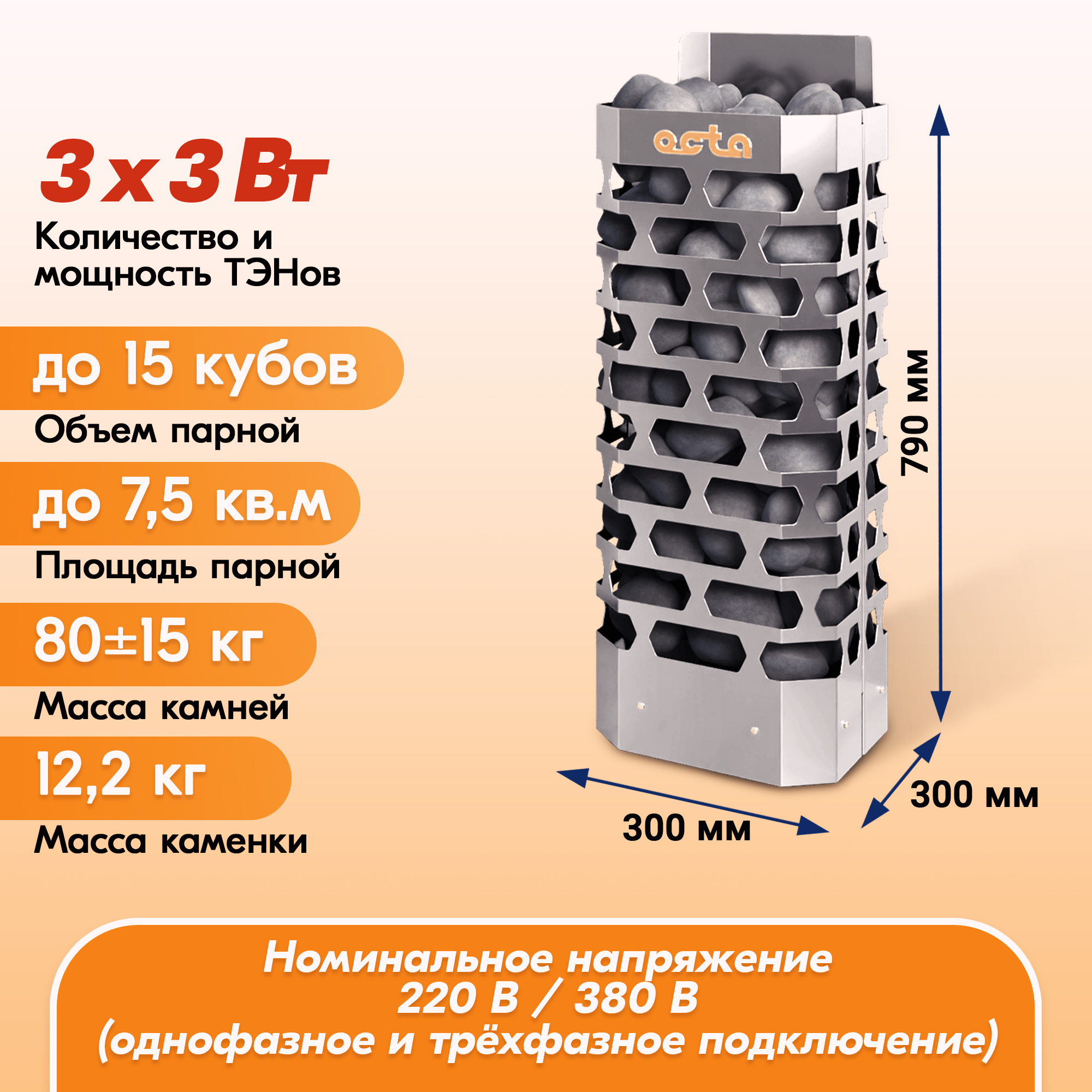 Печи-электрокаменки  СТЭН Octa – 4, -6, -9 предназначены для нагрева воздуха и получения сухого пара в банях и саунах.