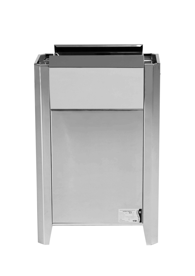 Корпус этой электрокаменки изготовлен из нержавеющей стали, а это надежность, износостойкость и отличные теплообменные качества.