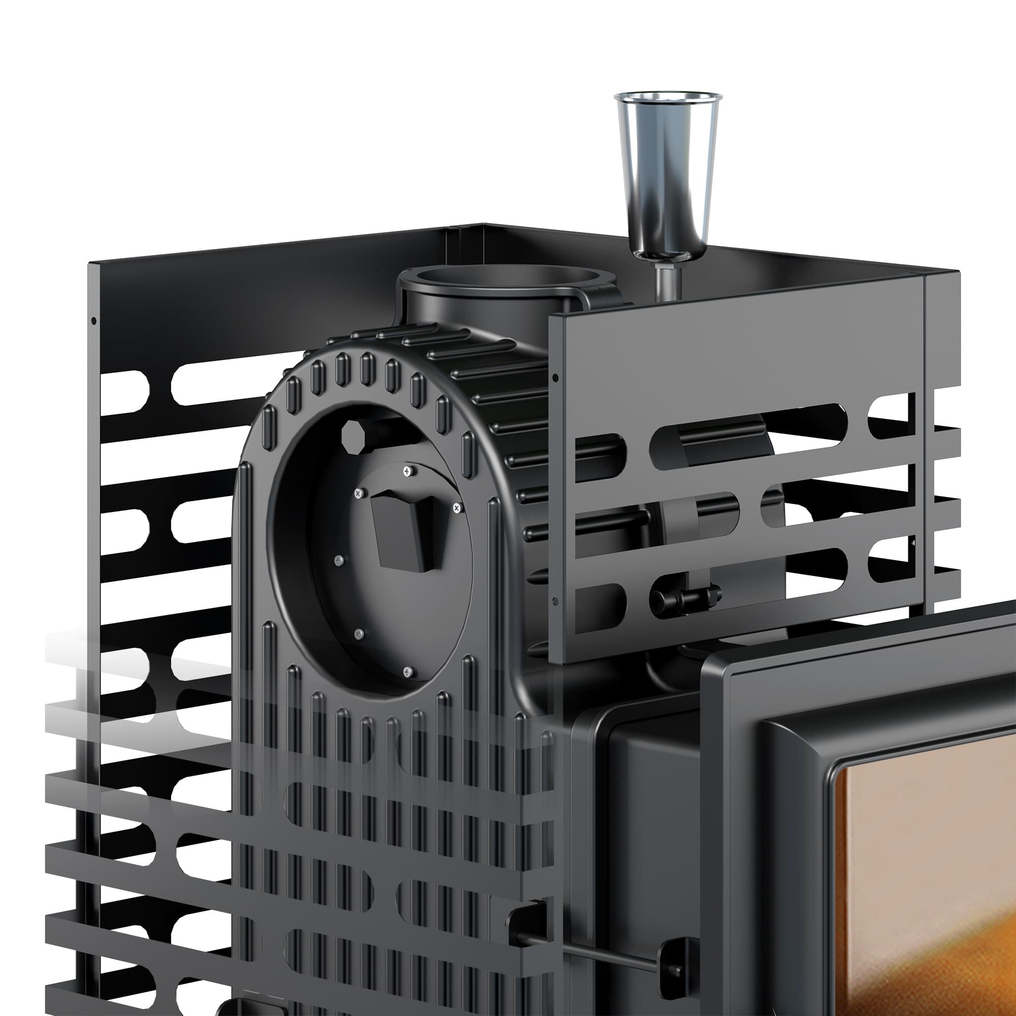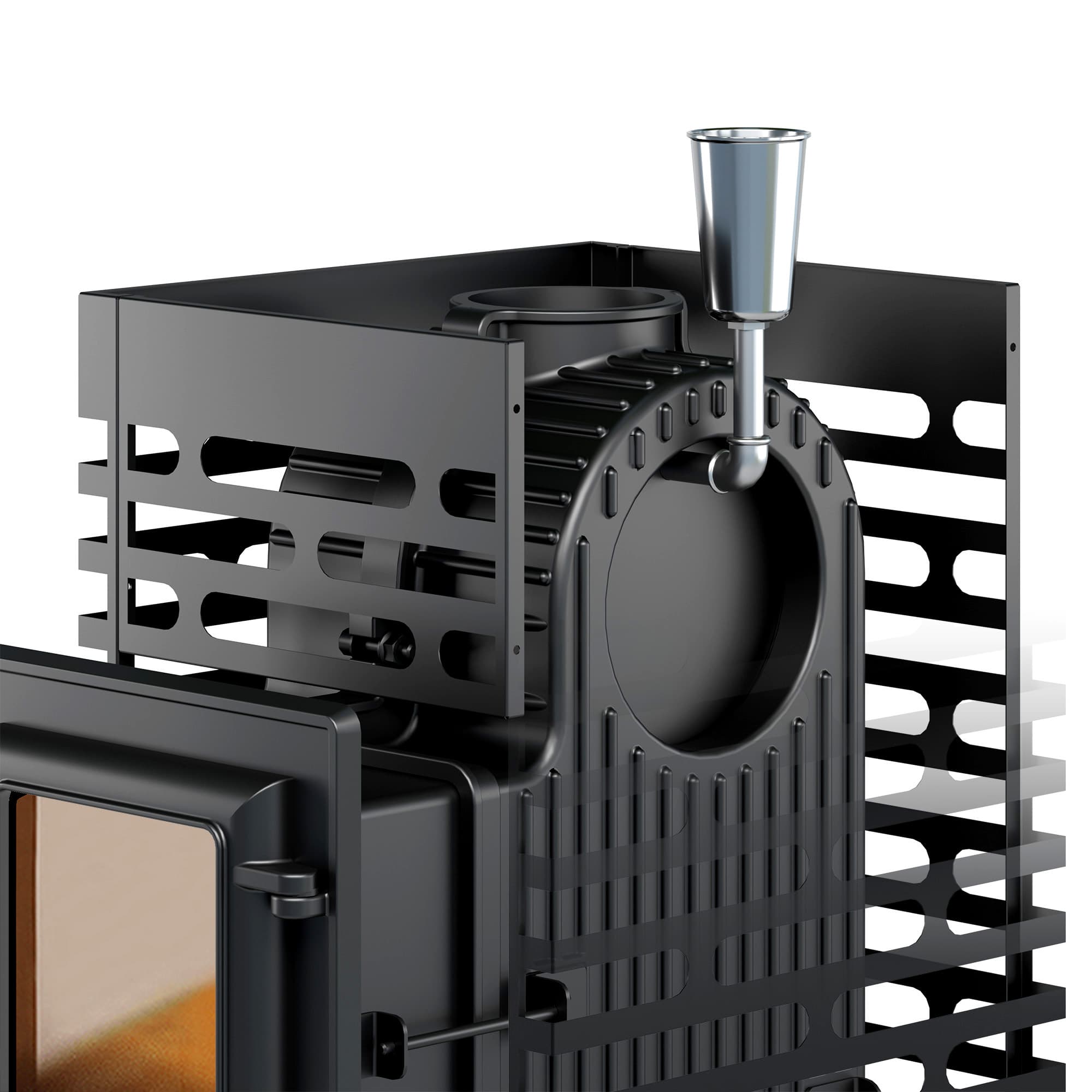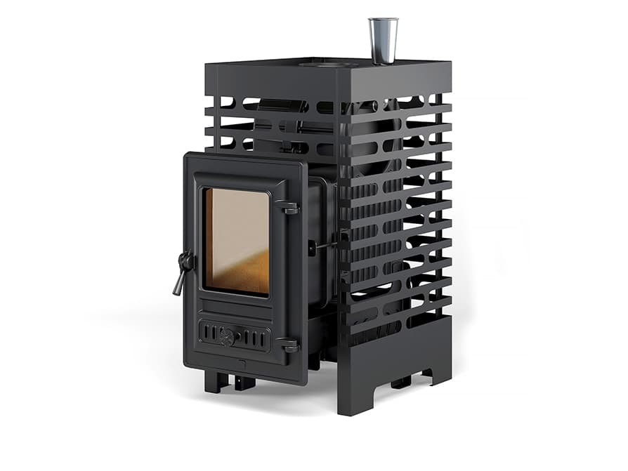 Закрытая каменка из нержавейки, размещённая в самом горячем месте печи.