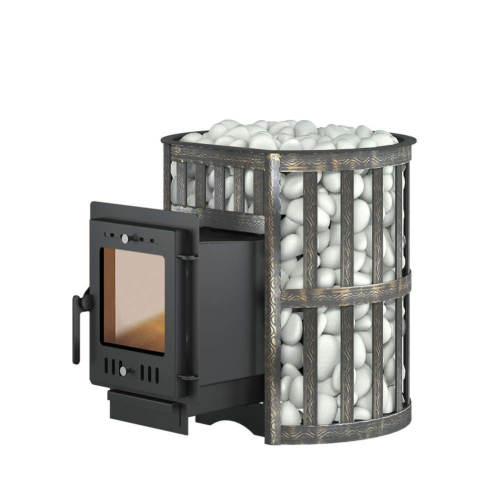 Для устройства наружной открытой каменки печь ЭТНА 18 оснащается сеткой из стальной ленты. Узор на наружной поверхности сетки патинирован термостойкой бронзовой краской. Пространство между печью и сеткой заполняется камнями для бани, которые выполняют роль теплонакопителя, перераспределяют тепло от стенок топки и защищают парящихся от жёсткого инфракрасного излучения. Воду подают на нагретые камни, с которых полученный пар распространяется по всему объёму парной.