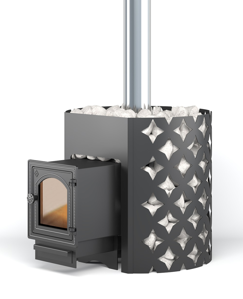 Для устройства наружной открытой каменки печь ЭТНА оснащается металлическим кожухом с прорезным рисунком оригинального дизайна. Пространство между печью и кожухом из двухмиллиметровой стали заполняется камнями для бани, которые выполняют роль теплонакопителя, перераспределяют тепло от стенок топки и защищают парящихся от жёсткого инфракрасного излучения. Воду подают на нагретые камни, с которых полученный пар распространяется по всему объёму парной.