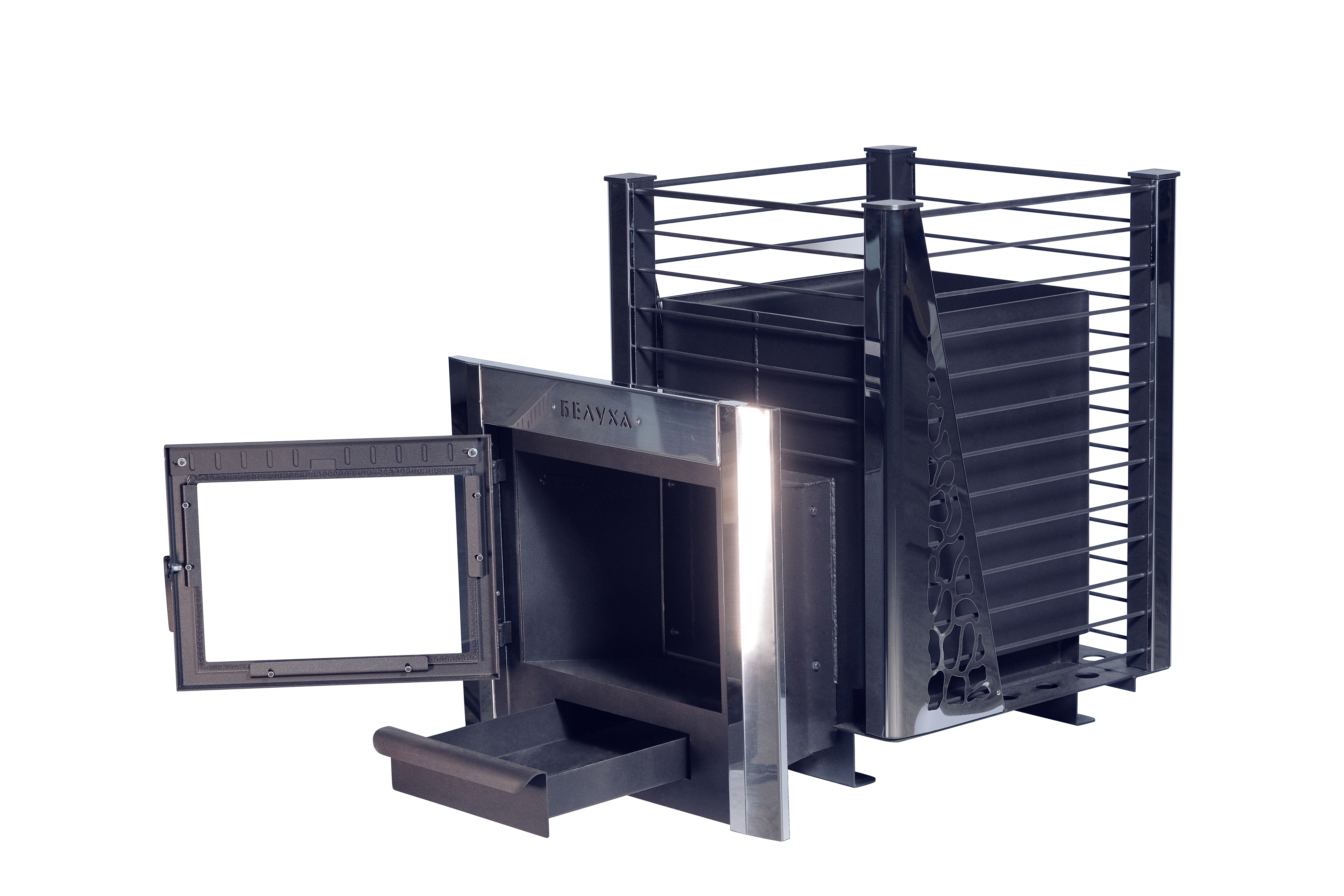 Печь "Белуха" оснащена выносным топливным каналом и панорамным термостойким стеклом, позволяющим наблюдать за процессом горения и топить печь из смежного помещения.