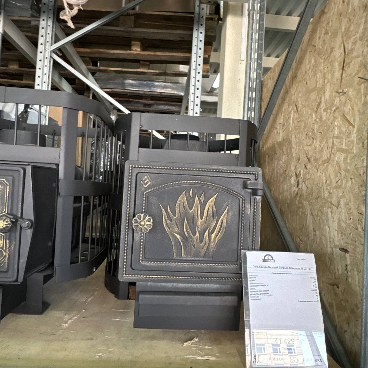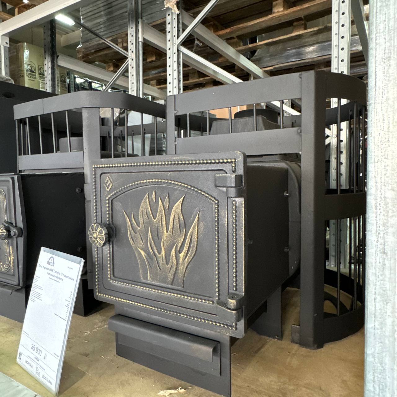 Банная чугунная печь Легенда Стандарт 12 (Дт-3) укомплектована чугунной дверцей Везувий Дт-3.  Конвекционно-вентилируемый кожух "Стандарт" изготовлен из металлического прутка диаметром 6мм покрашенной черной термостойкой краской.
