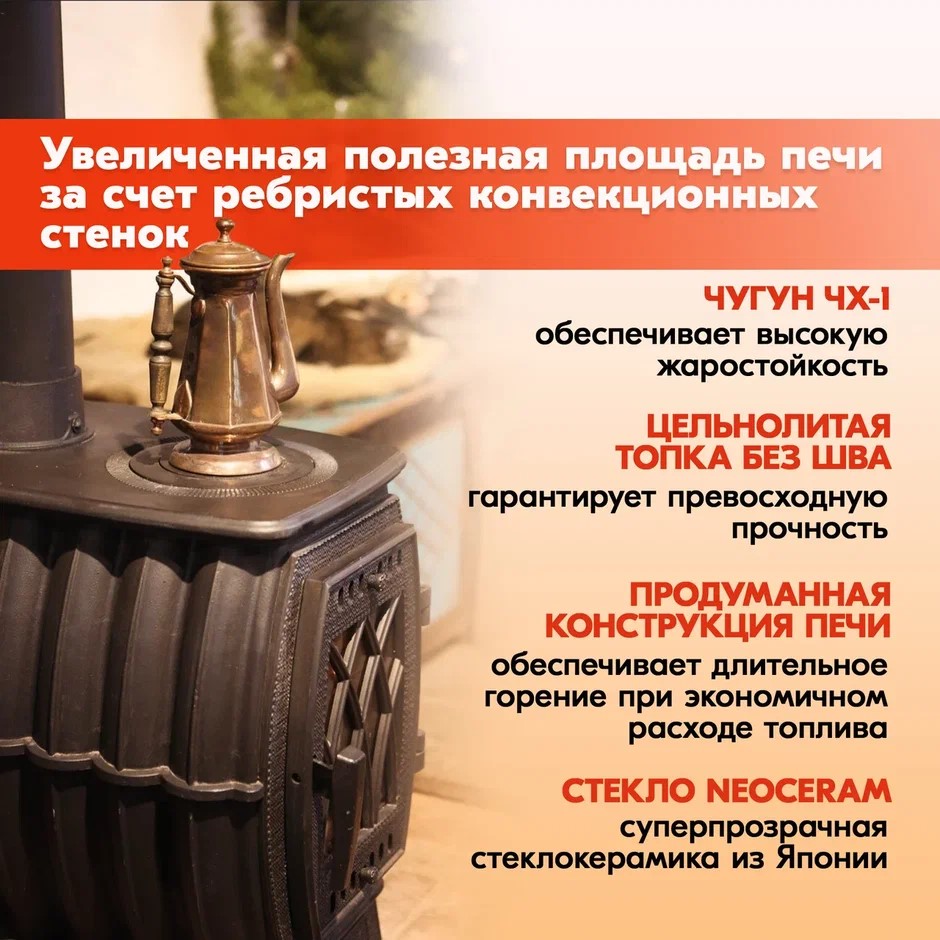Прекрасно подойдет в качестве печи для дома или дачи. Печка создает комфортную теплую циркуляцию воздуха в помещении.