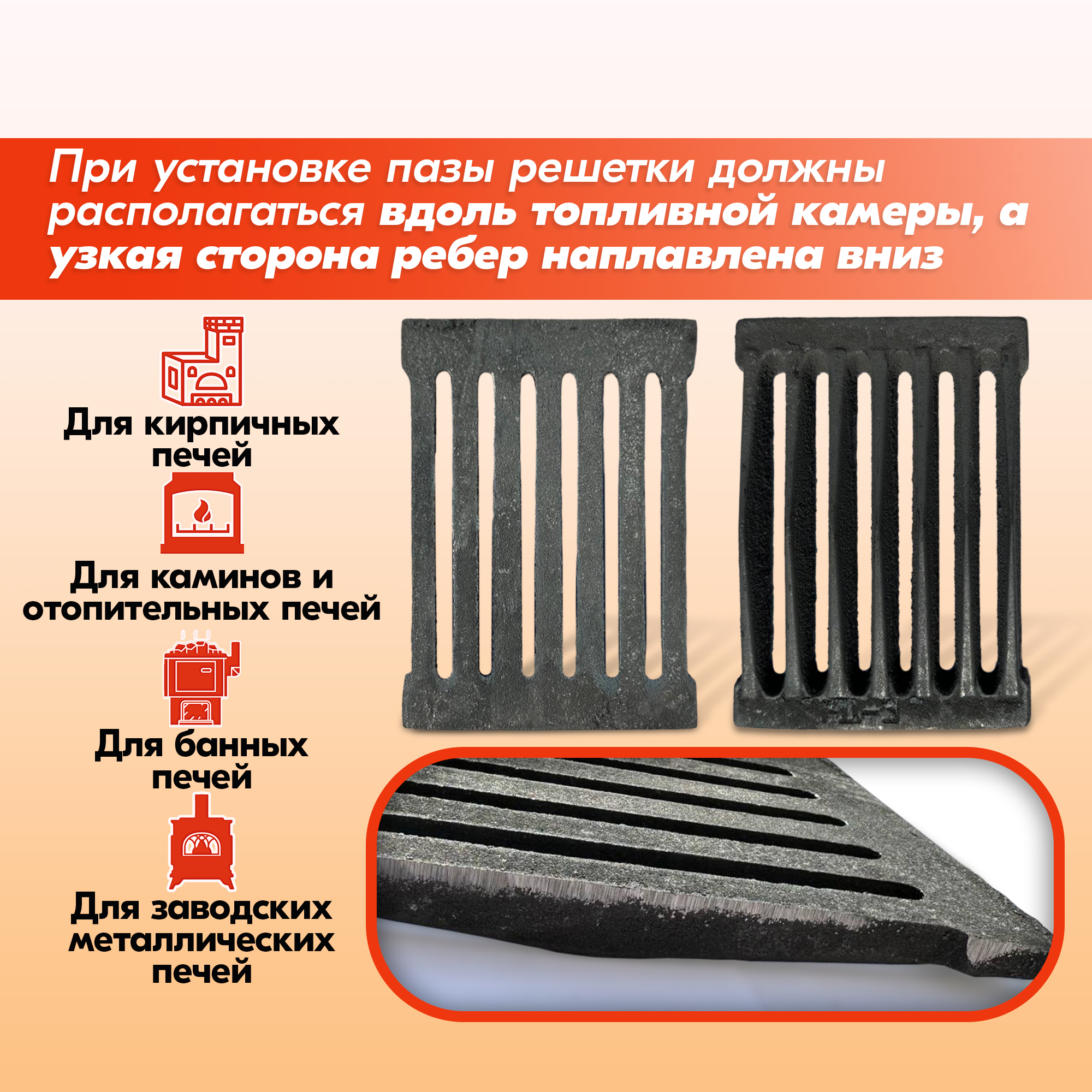 Колосник нужно устанавливать узкой стороной рёбер вниз, в противном случае срок его службы значительно снижается.