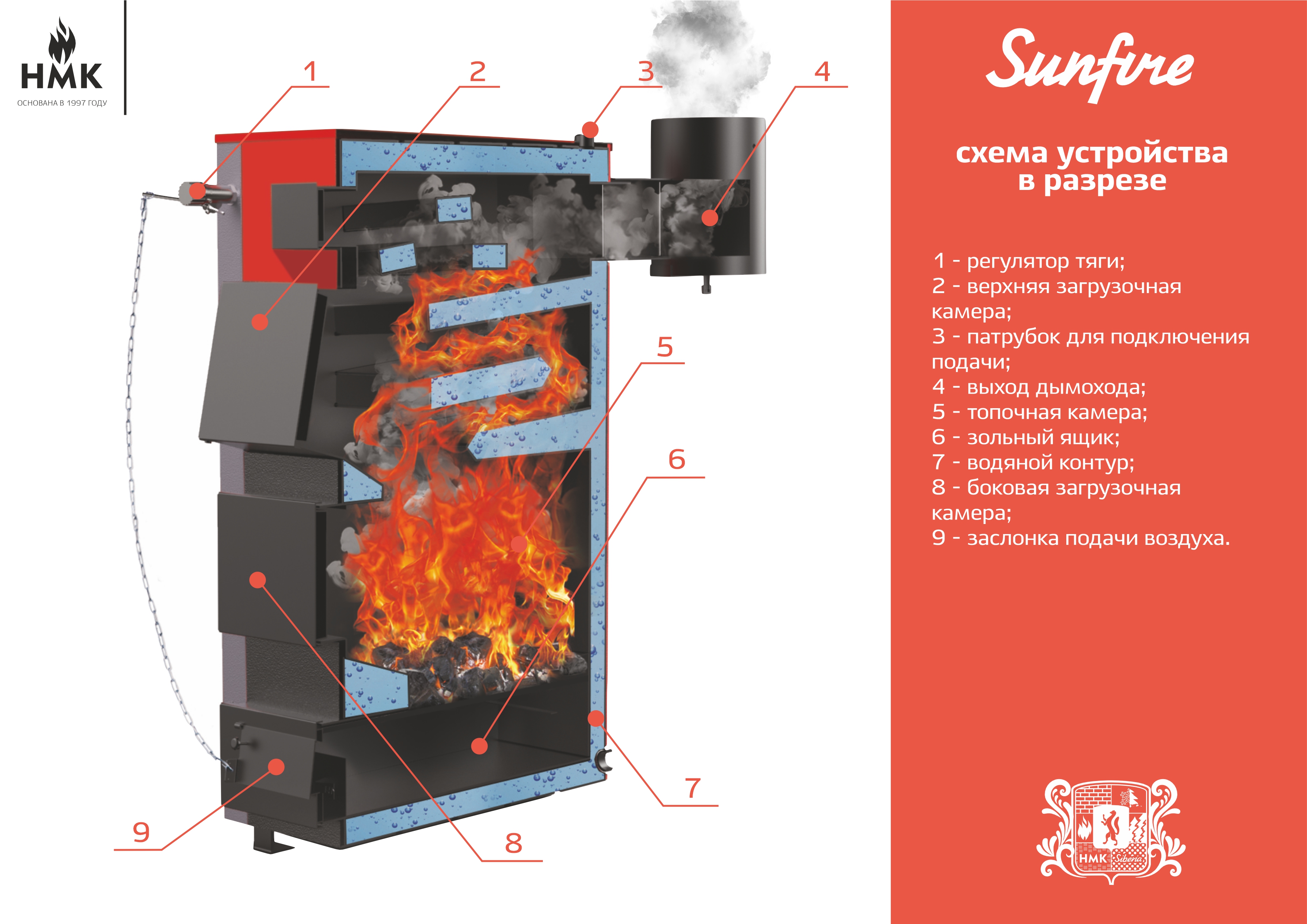 Котел "Sunfire" 60 кВт , также как и все котлы данной серии, является высокоэффективным твердотопливным котлом, его КПД составляет 85%, что значительно выше в сравнении с другими моделями производственной линейки завода "НМК" и тем более рыночными аналогами.