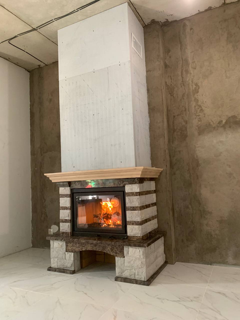 Установка Каминной топки, облицовки и монтаж дымохода через стену